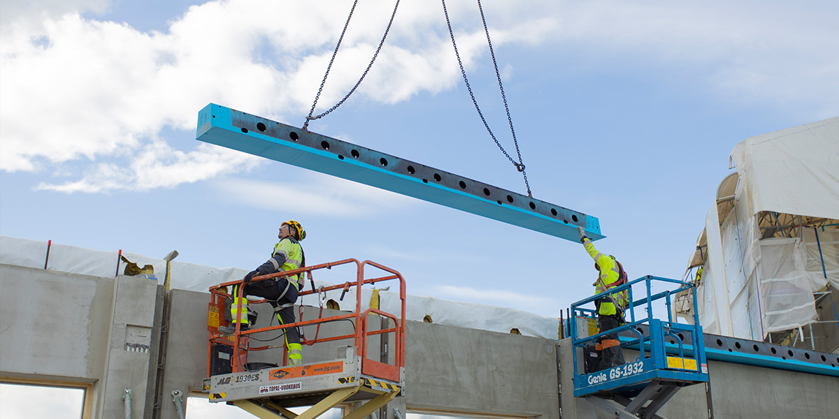 A-BEAM® W är däremot fabriksgjuten med betong och utvecklad för prefab- och vinterförhållanden. Dess hölje är tillverkat av stålplåt och dess böjmotstånd justeras med hjälp av armering och underflänsens tjocklek.