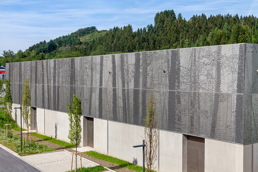 När arkitekterna ritade och byggde en gymnasieskola i Clervaux i norra Luxemburg valde de en fasad och solskyddslösning som sticker ut. Med hjälp av RMIG ImagePerf, replikerades ett foto av en vårskog på perforerade metallplåtar som får skolans arkitektur att harmoniskt passa in med den omgivande skogen.