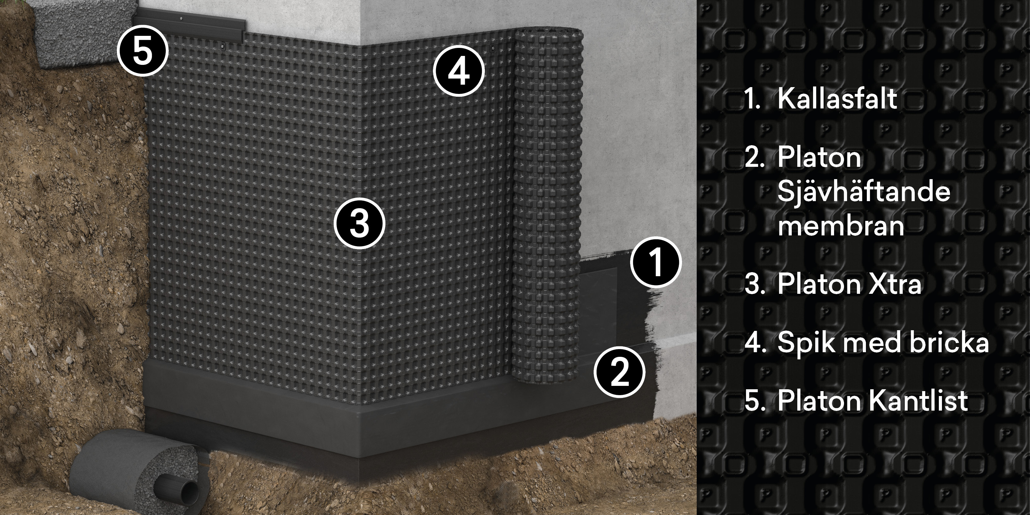 Byggnadsdelar under mark kan påverkas av stora mängder fukt, ytterst i form av fritt vatten som vill in i huset. Det är viktigt att skydda väggkonstruktionen mot stora vattenmängder i marken, vid ökad nederbörd, extremväder med skyfall mm som nu är alltmer förekommande blir betydelsen av ett starkt fuktskydd på väggen allt viktigare. Platon Xtra är ett komplett system som läggs som ett skyddande skikt på grundens utsida.