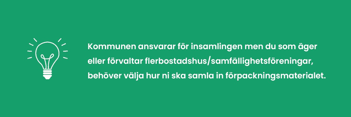 Senast den 1/1-2027 ska alla hushåll i Sverige kunna lämna förpackningar för återvinning i eller nära den egna fastigheten. Fastighetsägare som inte redan ger sina boende denna möjlighet behöver börja planera för det.