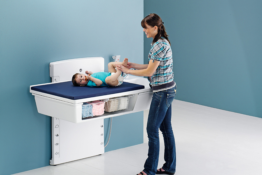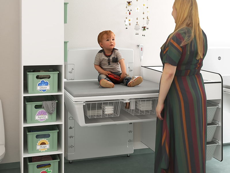 Skötborden finns också i en lågt monterad modell som de större barnen i förskolan själva kan klättra upp på. Personalen undviker därmed olämpliga lyft, och den höj- och sänkbara funktionen skapar en ergonomisk och hälsosam arbetsmiljö – till nytta för både personalens välbefinnande och barnens säkerhet. De integrerade säkerhetssystemen förhindrar klämskador, och produkterna levereras färdigmonterade.