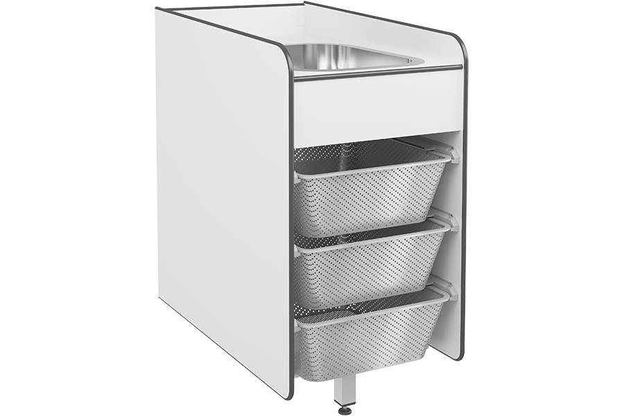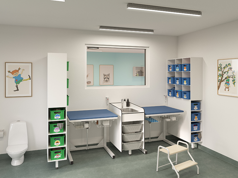 Tvättskåpet kan placeras mellan två höj- och sänkbara skötbord, så att båda platserna kan dela tvättställ och extra trådkorgar. Det frigör utrymme och skapar hygieniska arbetsförhållanden. Bordet är tillverkat i högtryckslaminat, som är lätt att rengöra, och skötmadrasserna kan enkelt torkas av efter användning och finns att köpa i tre färger.