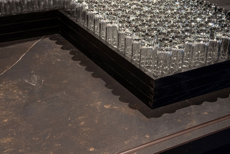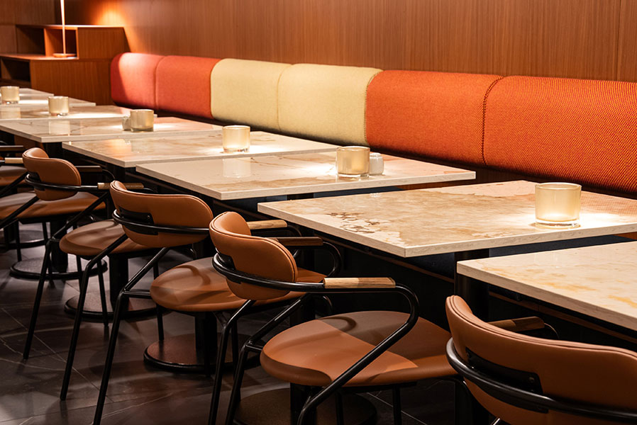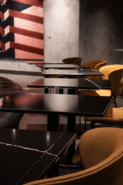 Designteamet ritade här in den högblanka Dekton Khalo som matbord i olika former och storlekar runt om i restaurangen som samspelar fint med övriga färger och träpaneler. Det är samma Dektonndesign som bardiskarna och knyter därmed samman entrén med restaurangen.