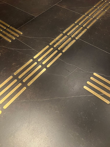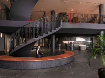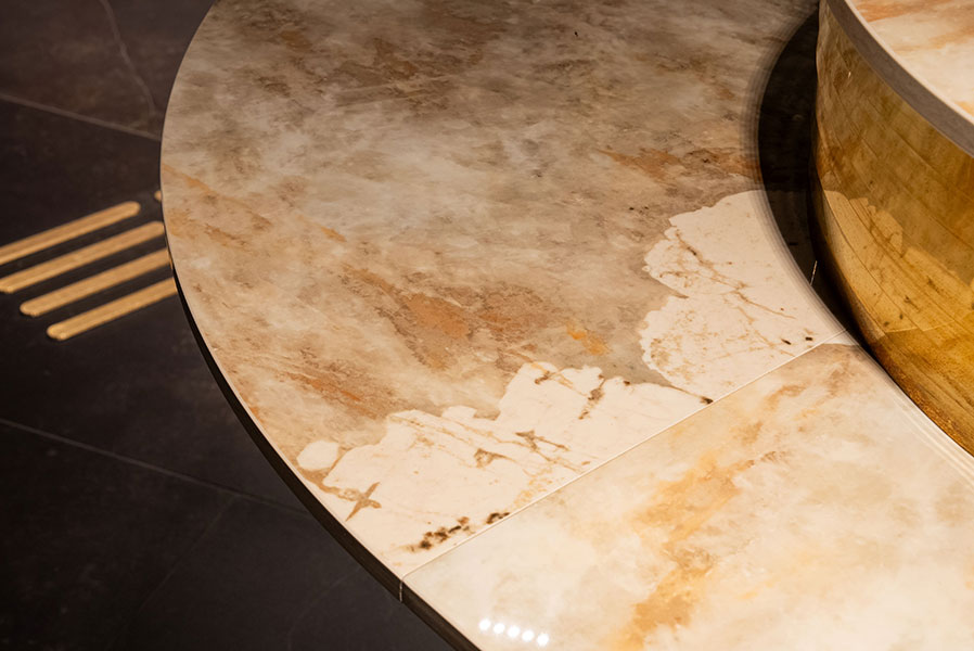 Alla entrégolv är gjorda av Dekton Kelya med några gyllene detaljer som fångar din blick och ger dig vägbeskrivning. Samma färg/design finns även i trapporna som leder upp till de första våningarna och konferensområdena. Det mest iögonfallande inslaget måste vara den arkitektoniska delen som består av den rundade soffan tillsammans med spiralförvaringen i receptionen, som sträcker sig över de tre första våningarna. Båda följer exakt samma radie. Soffans bas liksom alla trappor är klädda i samma Dekton Kelya-sten som resten av de allmänna planlösningarna och hela räcket är en designflirt till tornets unika konstruerade fasadform.