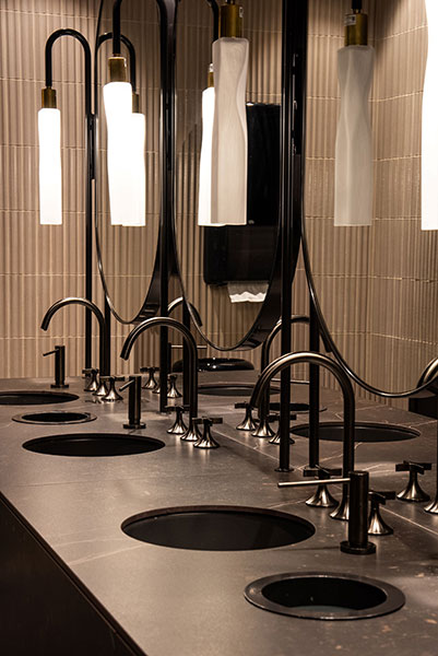 Även när man går in på de gemensamma toaletterna hittar man dessa bänkytor och på entreplanens alla golv som en viktig funktion och en kontinuerlig upplevelse av denna mörka dramatisk marmorerade Dekton-färg vid namn Kelya. Restaurangen följer samma färg och materialval för en enklare hantering av frukost och varma bufféer/rätter finns alla gemensamma utrymmen och serveringsöar alla i vackra Dekton Kelya.