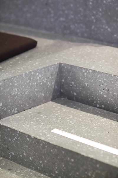 Terrazzo är ett förträffligt material när det gäller att skapa tydliga kontraster för synsvaga. Just kontrastmarkeringar i trappor kan se ut på flera sätt! Oavsett hur de är utformade har de gemensamt att de markerar det första och sista steget. Herrljunga Terrazzo gör trappbeklädnader med flera olika möjligheter till stegmarkeringar. I terrazzotrappor går det att exempelvis välja: