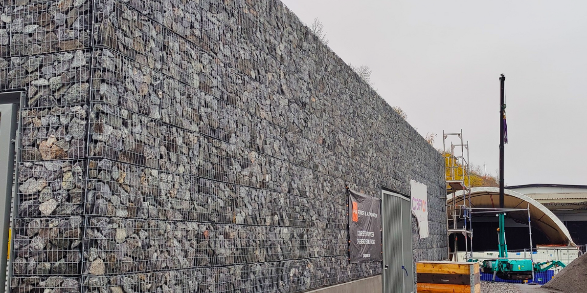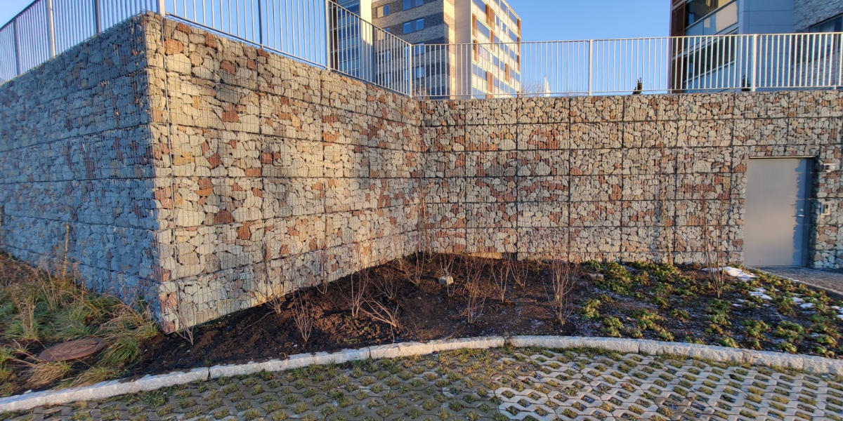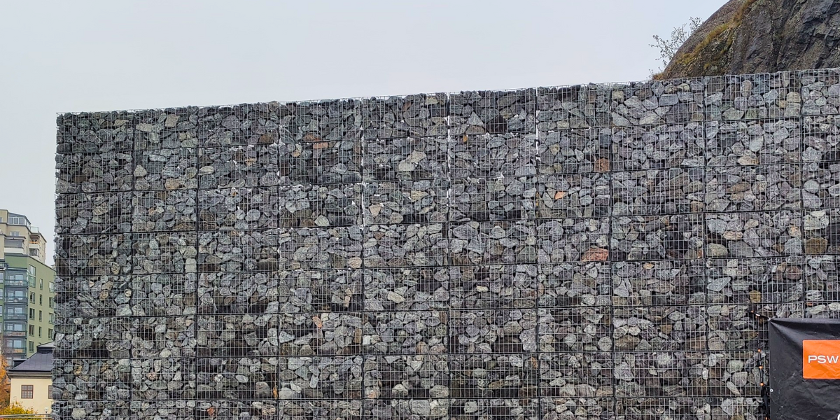 Gabionkorgarna levereras som färdigmonterade enheter och fylls med natursten på plats. Resultatet är ett stabilt men flexibelt system som kan användas både i nya konstruktioner och vid renovering av befintliga betongväggar.