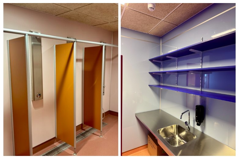 I flerbrukshallen finns sex elevomklädningsrum och fyra domar-/läraromklädningsrum. Dessutom har skolan särskilda personalduschar för anställda som cyklar eller springer till arbetet. Alla våtrum och toalettzoner är klädda med Fibo väggskivor – ett medvetet val för att säkerställa slitstyrka, enkel rengöring och långvarig kvalitet.
