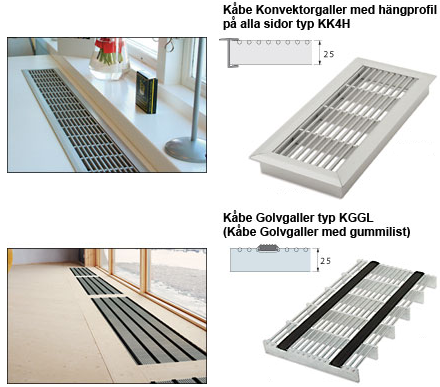 Kåbe Golvgaller installeras utmed glaspartier och skyltfönster som konvektorgaller i golv.