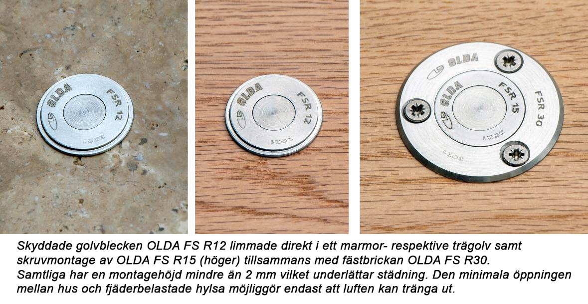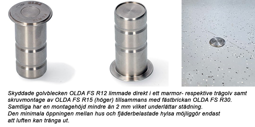 Som alternativ monteringsmetod använda fästblecket OLDA FS R30 med ytterdiameter 50 mm används för att skruva fast FS R12 / R15 direkt i solida golv eller breda trösklar.
