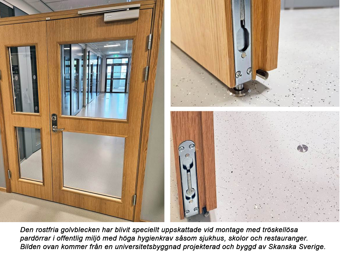Tillverkningen sker i vår egen verkstad i Landvetter och golvblecken är helt gjorda av rostfritt stål. Produkten är speciellt utvecklad för limning direkt i golv, vilket möjliggör extra god anpassning mot regel genom att låta limmet härda över natten med stängda pardörrar.