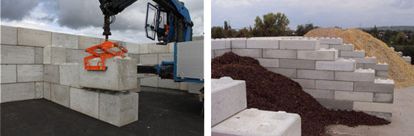 För flexibla planlager eller robusta stödmurar, förvaring och avskiljning av material fungerar de här blocken utmärkt. Dessutom ger de då samtidigt ett 80 cm tjockt brand och bullerskydd.