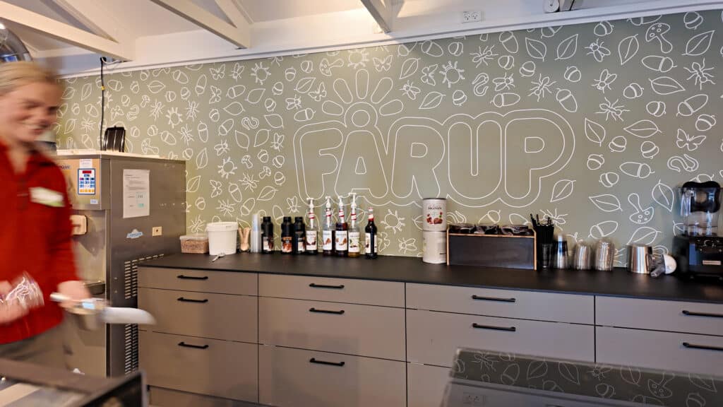 I Café Vest, nära ingången, kan man köpa nybryggt kaffe och samtidigt njuta av dekorativa 5206 Olive Green – med specialanpassat grafiskt mönster fräst i skivorna. Mönstret speglar element från Fårup Sommerlands grafiska profil och bidrar till ett enhetligt visuellt uttryck.