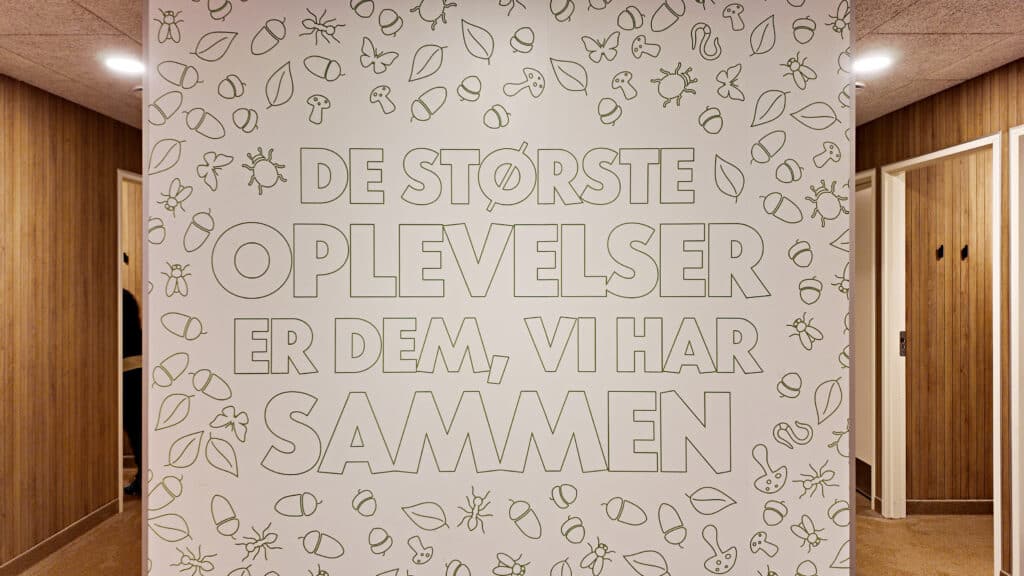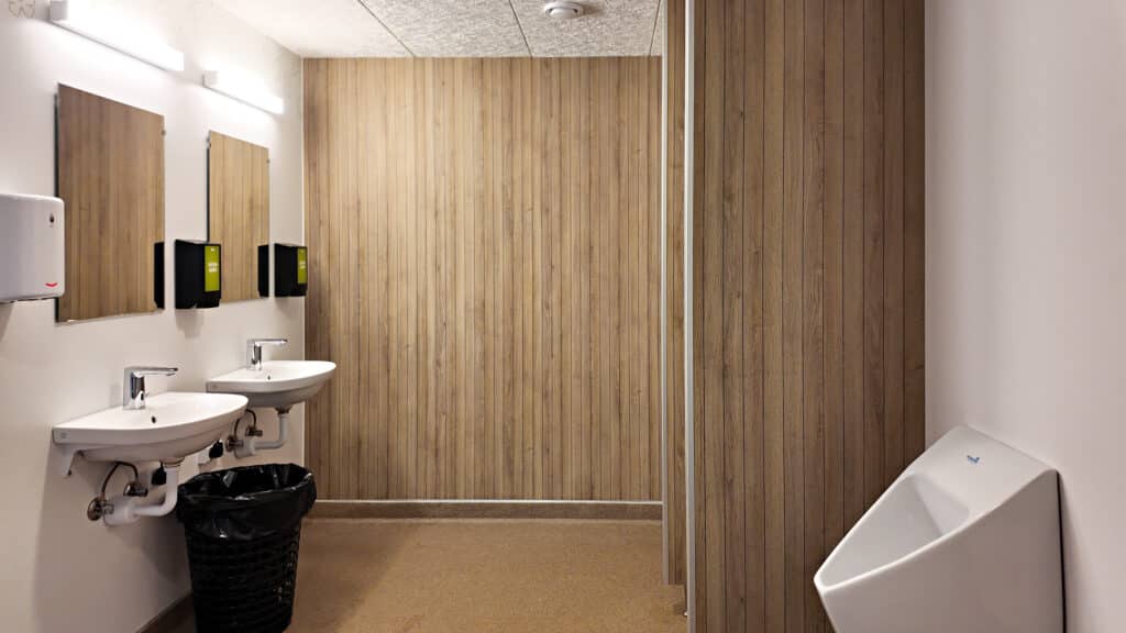 I ett stort toalettområde vid huvudingången – inklusive herrtoalett, amningsrum och personalens egna faciliteter – har man använt en kombination av 2164 Pure Oak med lamellmönster och specialfrästa skivor i dekoren 9003 Go Green. De vita skivorna i projektet är genomgående specialfrästa med element från Fårups visuella profil – en långsiktig lösning som både är enkel att rengöra och ser fräsch ut år efter år.