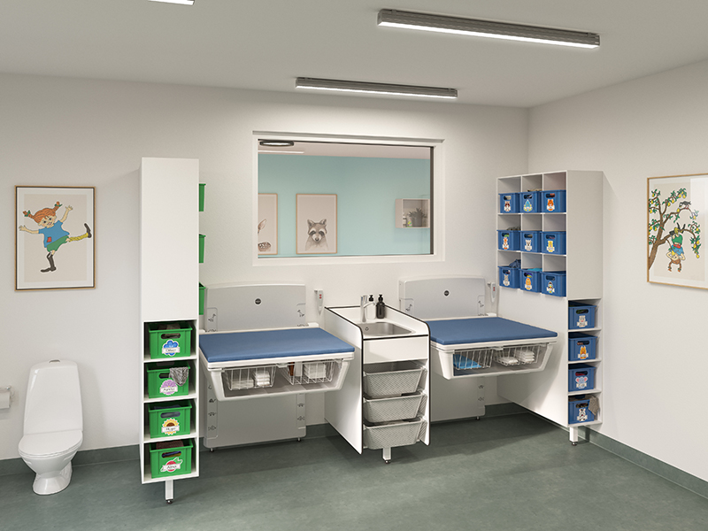 Placeras skåpet mellan två höj- och sänkbara skötbord kan båda enheterna dela samma tvättställ. Det minskar installationsbehovet, frigör yta och förenklar planeringen av funktionella, hygieniska skötrum.