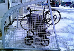För två cyklar. Cykeln förvaras på golvet med det bakre däcket vilande mot räcket och låsning.
