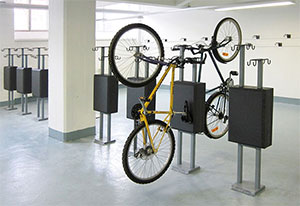 Glidlagringssystem för cyklar. Två cykelstolar i olika höjder. Förvara styret mot sadelstödet.