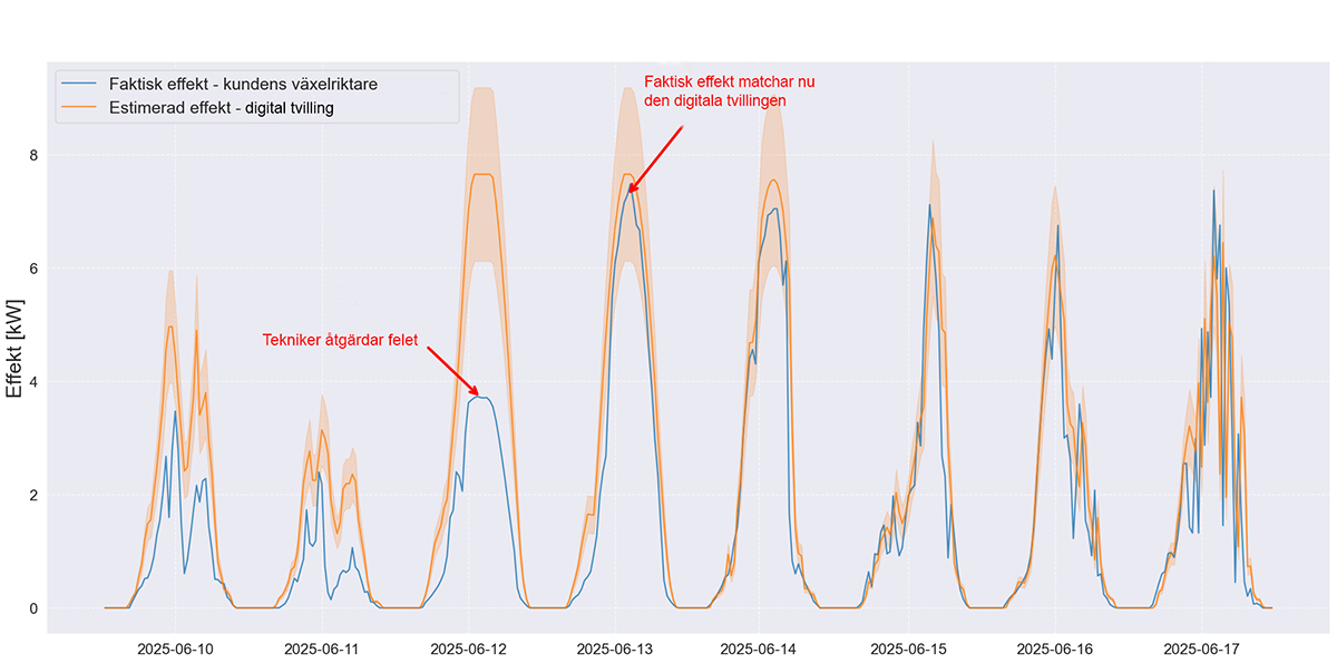 Med en exakt kopia av anläggningen beräknar vi löpande hur mycket energi dina solceller ska producera, baserat på solinstrålningsdata och faktorer som solcellernas lutning, vädersträck och anläggningens geografiska plats. Det här gör att vi snabbt kan upptäcka om anläggningen underpresterar och återkoppla till dig genom vårt supportteam. Vi kallar det proaktiv felavhjälpning.